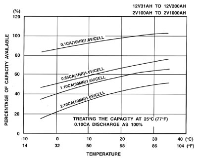 溫度對(duì)電池容量有顯著的影響,溫度降低,電池容量下降,請(qǐng)參考曲線圖。